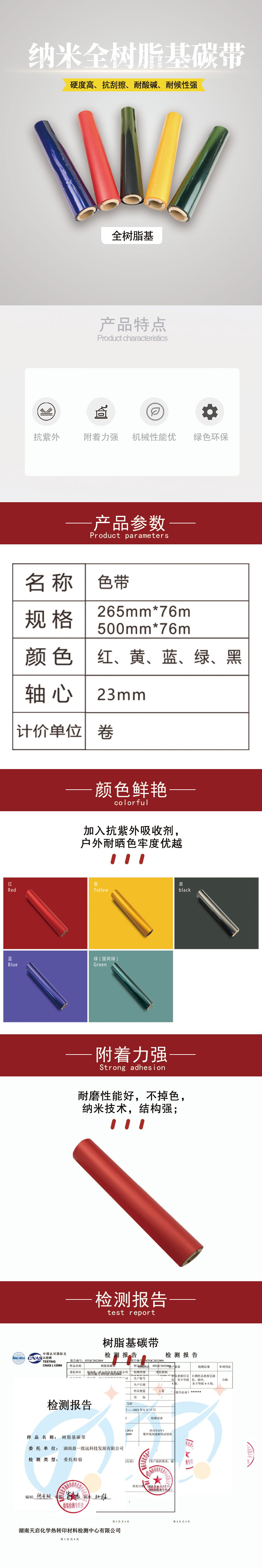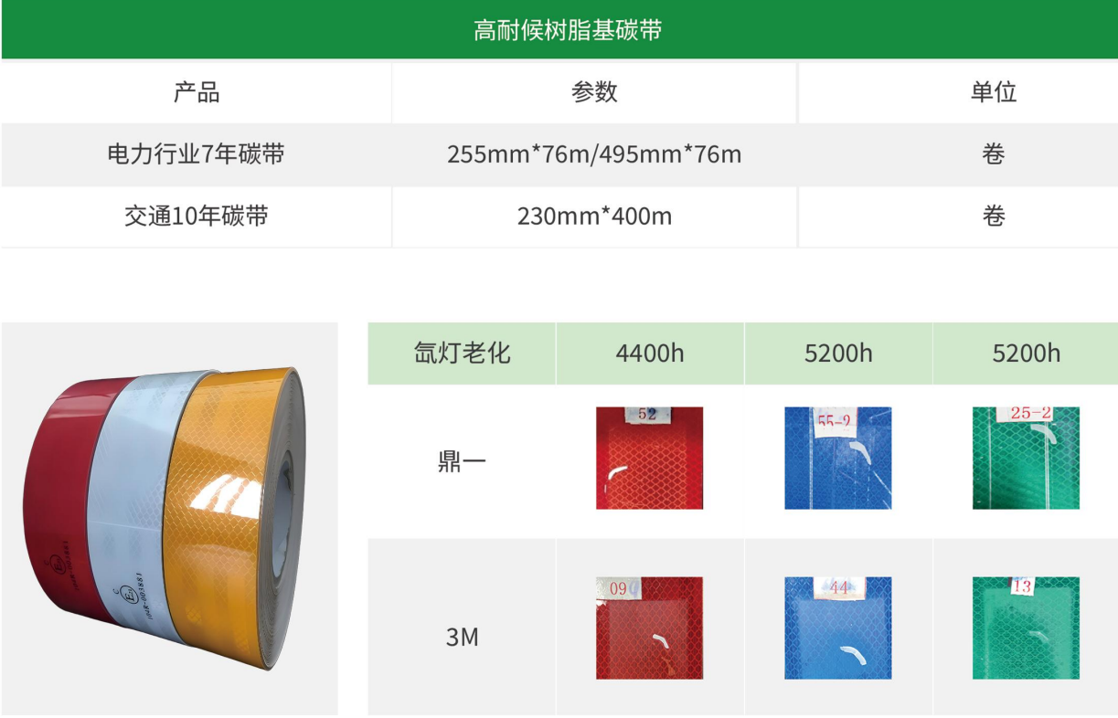 自研納米級耐候六色碳帶(黃、橙、紅、藍、綠、棕)1μm 超薄圖層及專用耐候配方設計,同時滿足國標對逆反射系數(shù)與耐候性的要求,是當前最成熟的交通標識牌印刷解決方案。只有鼎一可以做到十年戶外高耐候的使用壽命,其他廠商只能做到戶外耐候不超過兩年。具有硬度高、抗刮擦、耐酸堿、耐候性強等優(yōu)勢,可適應多種承印物。使用全樹脂基碳帶作為熱轉印專用耗材,其制作出的標識可有效抵抗戶外惡劣環(huán)境滿足更多應用需求。